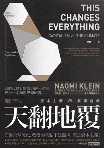 延續《NO LOGO》對消費資本主義浪費資源的批判、與《震撼主義》對災難資本主義的攻擊,本書探討了近年來環境災難惡化的重要根源之一:資本主義能源產業造成的氣候變遷,討論了面對氣候變遷的各種「綏靖」方案,主要是不挑戰大財團的市場壟斷與政治權力,與其妥協下零碎化的綠色資本主義、氣候慈善或氣候變遷調適,甚至去發展不確定性更大的氣候工程學等。《天翻地覆》一書的觀點,即是這些與財團大老妥協的綏靖方案不可能奏效,在民眾民主監督下,由國家或地方政府進行的公共投資或管制措施、與打擊大財團的限制碳排放政策才是正途。娜歐蜜‧克萊恩的警世之言甚是,但誰能力挽狂瀾?