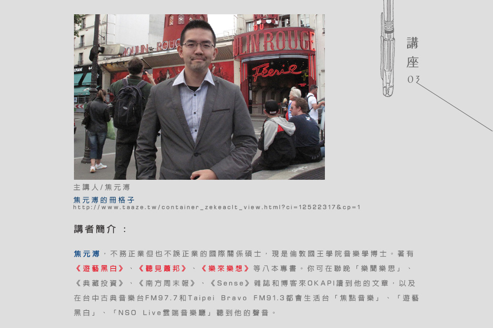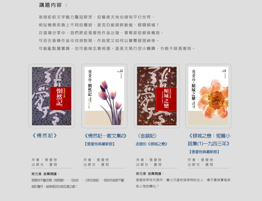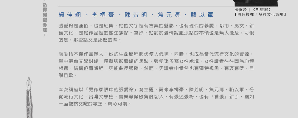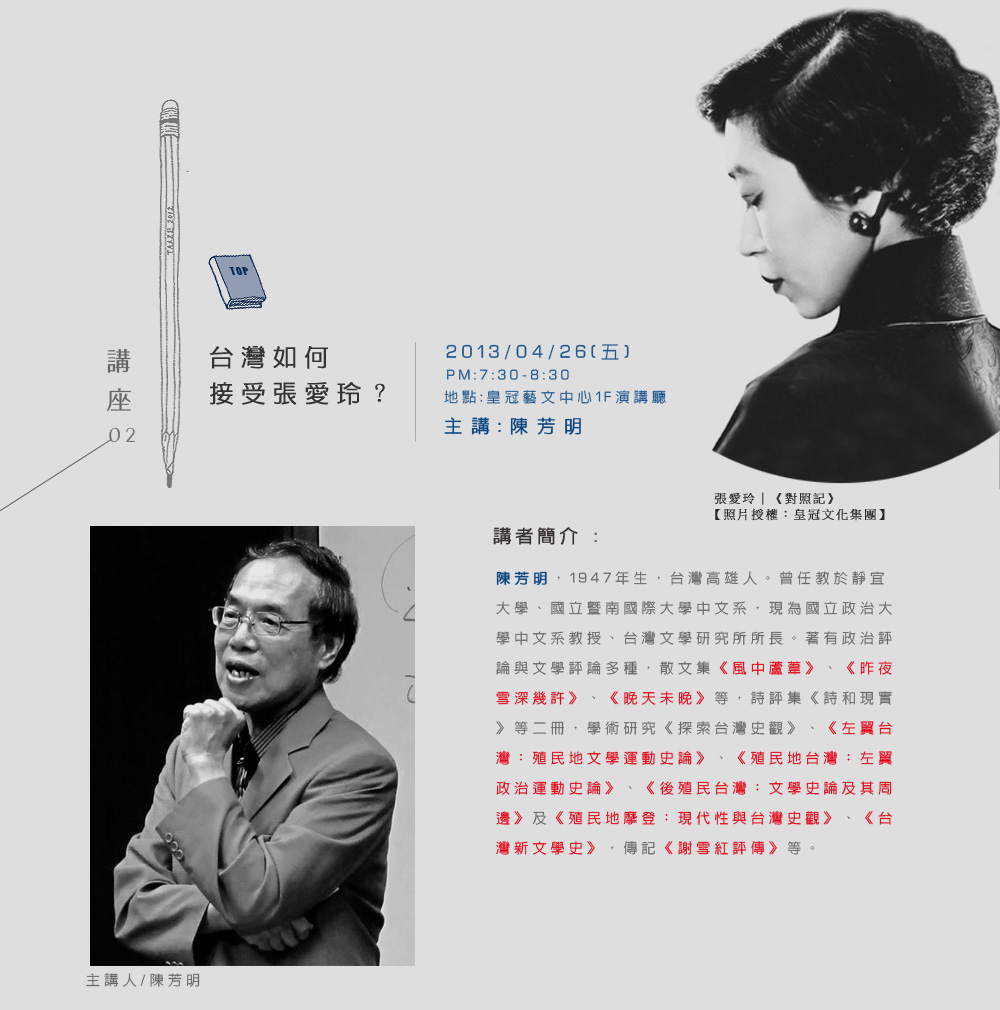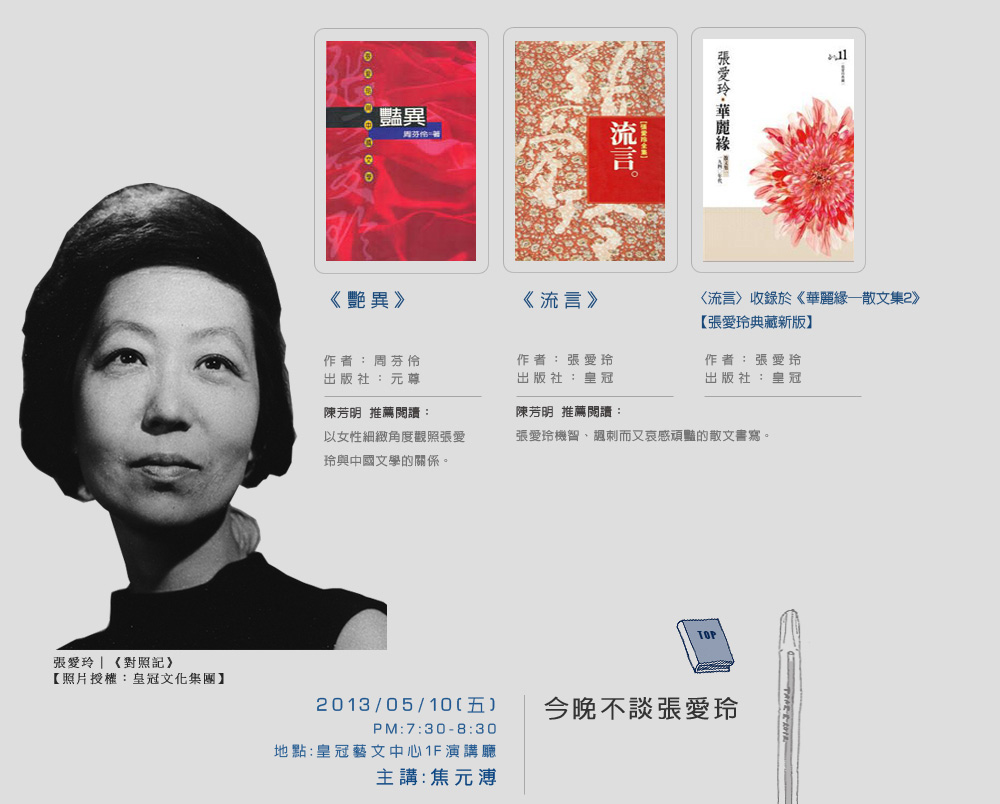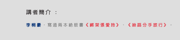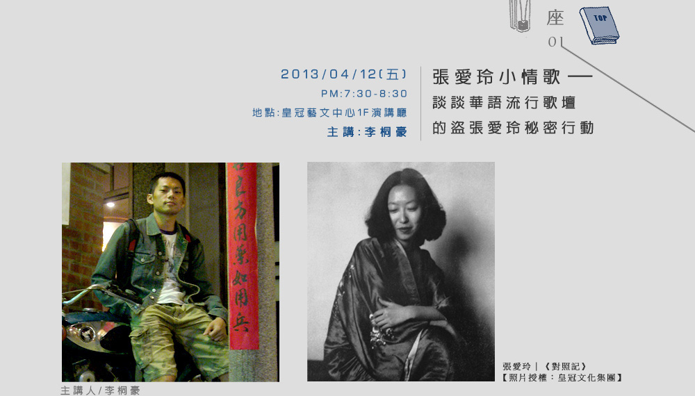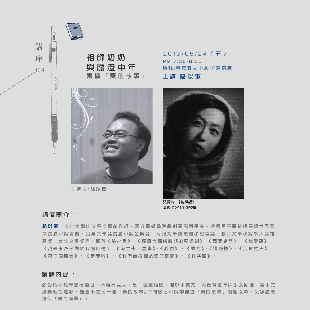 【講座報名方式及場地】 主辦單位:TAAZE讀冊生活、皇冠文化集團、聯合文學、BIOS 講座完全免費,講座採線上報名制 皇冠藝文中心1F演講廳:座位共80席,報名若座位數額滿,可立席旁聽 講座地點:皇冠藝文中心,台北市敦化北路120巷50號 http://goo.gl/O1hF3 若有相關講座問題,請洽TAAZE讀冊生活客服專線:02-2712-0369