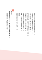 有些傷痛我們習慣放在背後,久了就成為我們的影子,以為看著前方就能淡去,卻一生如影隨形。作者以諮詢師的專業與角度,寫下我們每個人生命中都可能存在著的種種艱難與困擾,也許是解答,又或者是路口的指標,但願你我都能在這本書裡,學會擁抱自己,從文字中得到療癒。