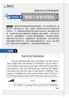 新制Part 3閱讀理解的最大特色,就是增加了「雙篇文章對照題組」,而且其中有可能出現「訊息對話」類型的文章。另外,單篇文章也有文化、社會、資訊科技等較高水準的主題。所以,書中除了提供新類型的題組以外,也提升了文章內容的水平,讓讀者能夠熟悉和以往不同層次的出題內容。