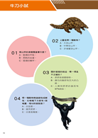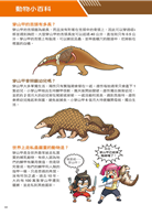 設有「動物小百科」單元,特別介紹穿山甲科動物和人科動物的構造與小常識,以及擅長爬樹和游泳的中華穿山甲、把鋒利鱗甲當成武器的樹穿山甲、擁有長長手臂和寬大臉頰的婆羅洲猩猩、透過喉囊膨脹來發出響亮聲音的合趾猿、可以經由符號字和人類溝通的黑猩猩、全家人會一起坐在樹上睡覺的紅頰黑猿等動物的超炫常識,讓小朋友有系統的學習。
