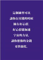 「我第一次將心態從匱乏調整為富足時,做了很多不同的練習,也自創了不少方法。我把最強效的練習,都收錄在這21天的實現財富旅程中。而我最愛的一項練習,就是把錢送出去。把錢拿給別人的時候,我會對錢有好感,而不是平常會有的負面感受。」如何快速轉化心中對金錢的負面感受,書中朗達.拜恩毫不保留地提供給你我一套可以照做的「致富系統」。