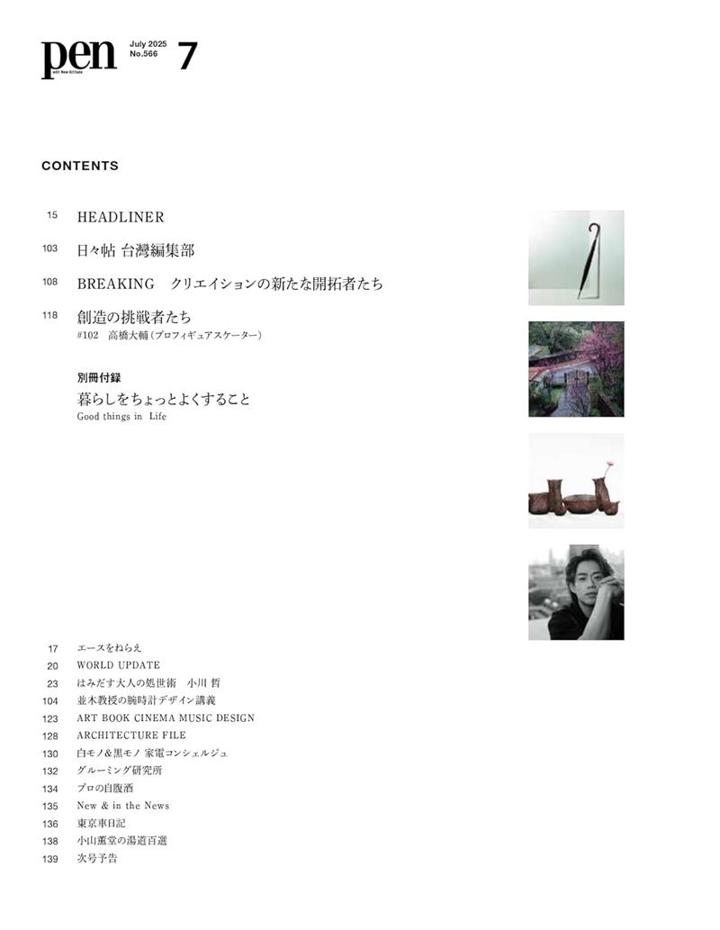 結合懷舊與創新的台灣,在日本人最愛海外旅行地排行榜中常常名列前茅,本期特別要收錄台灣特集,以「OLD MEETS NEW」為主題來帶大家深入探索台北與台南,希望大家可以透過本次特集來親自感受台灣的魅力,而每期都會訪問各領域名人的本誌人氣連載「創造的挑戰者們」,這一次特別要訪問到2023年引退後展開全新人生的前花式滑冰選手-高橋大輔。