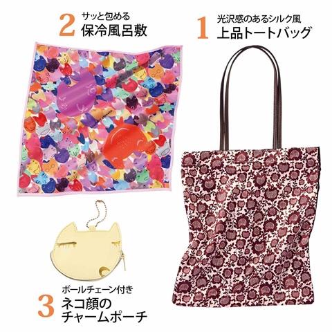附加商品說明:附TSUMORICHISATO托特包&包巾&造型收納包。提供一款托特包,一面是暗紅色系印花布,另一面是高雅的光澤感咖啡色。一條附保冷功能的貓臉圖案風呂敷包巾,以及一個可吊掛的貓臉造型拉鍊收納包。(托特包尺寸:高36.7、寬32、提把長54.5公分,材質:聚酯纖維、PVC,耐重量約8公斤。風呂敷包巾尺寸:40x40公分,材質:聚酯纖維。造型收納包尺寸:高9.5、寬11公分。材質:PVC、合金。)