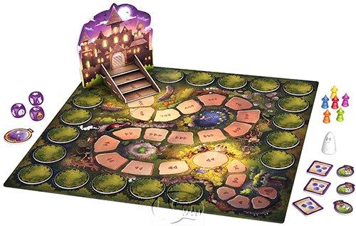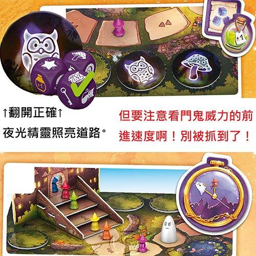 3 顆骰子(骰子面上共有16隻夜光精靈、1隻看門鬼和1罐魔藥)