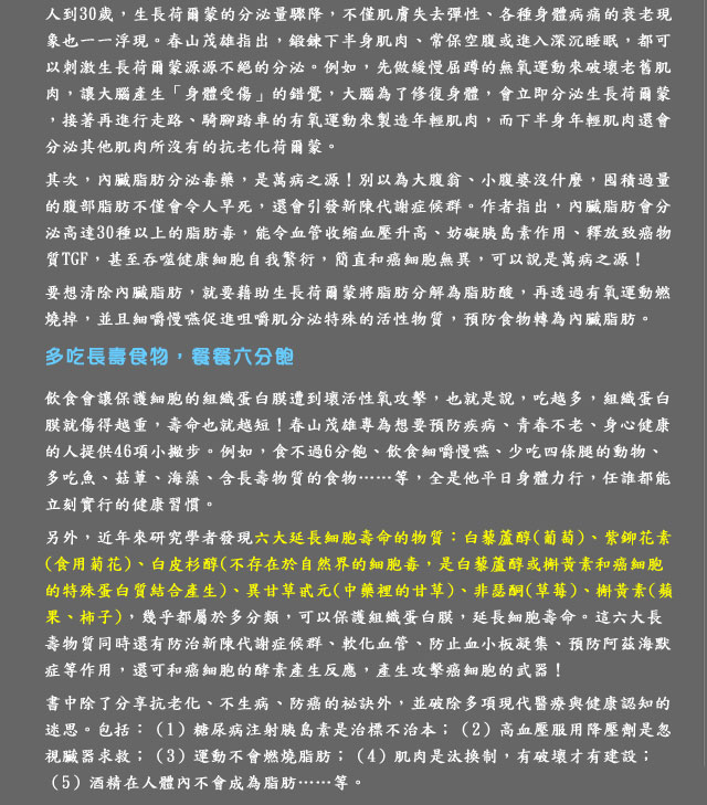 事實上,血糖值過高並非胰島素分泌不足,而是它的效用不好,無法正常發揮消解糖分的作用,所以是「質」的問題,而不是「量」的不足。根據研究,從健康的百歲人瑞身上,可以找出三項共通點,其中之一,就是「體內胰島素濃度低」。也就是說,健康長壽的人血中胰島素濃度普遍較低,一般認為這是因為他們的胰島素效用高,所以少量就能達到功效。會把飲食轉化為脂肪的胰島素,對身體而言無疑是「劇毒」,所以胰島素量少、質精、效率高,才是健康之福。