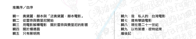 「用電影解釋電影──關於雷奈與費里尼的影響」、「關於楊德昌」、「只有蔡明亮」、「我─私人的─台灣電影」、「還有華語電影」、「現在是二十一世紀」、「以布萊德.彼特結束」九大單元、總計132 篇精彩文章、多達
