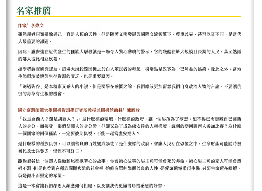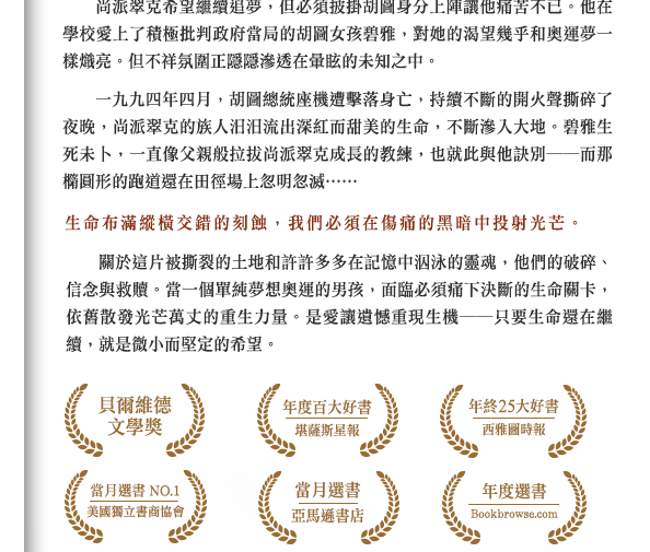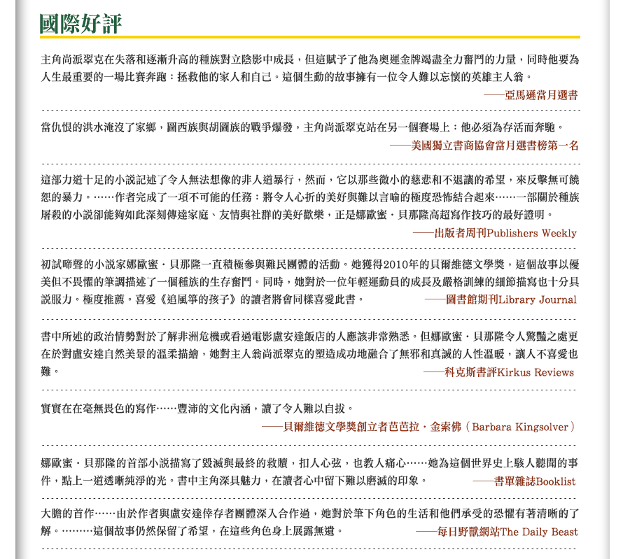 尚派翠克用手肘支起身子,看著爸爸循著黃色光束走向走廊,腳步聲踏在水泥地上發出回音。「爸爸,祝您平安,」他說,「願伊瑪納保佑您旅途平安。」十一、十二月的雨季名為「蓋休勾羅」,在這個時節裡尚古古的聯外道路經常化作一片泥沼,有時候尚派翠克走在這條路上,會陷進深及腳踝的爛泥巴裡。