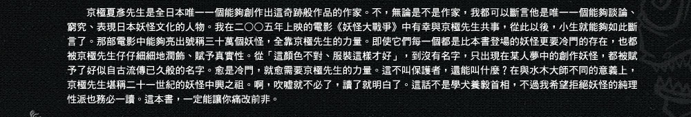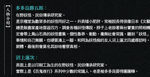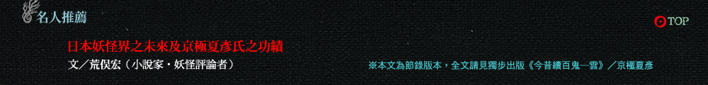 「這什麼話?不要拿我跟你相提並論。我是來親眼確認真言宗系修驗道中彌勒信仰的發展證物的。再說,我是在深入考察入定佛這種極端特異的風俗──或者說神聖的遺物,與民俗社會中的妖怪事象是否有所關聯。出於消遣心態跑來看的是沼上啦。」