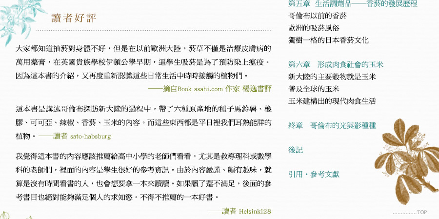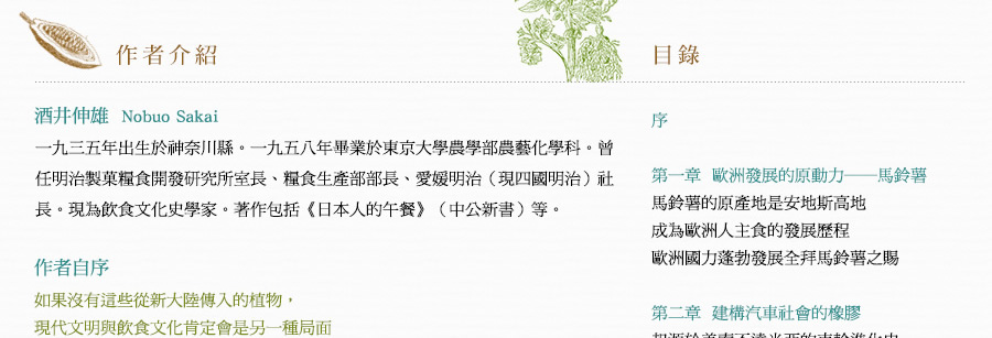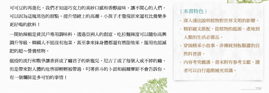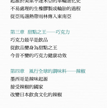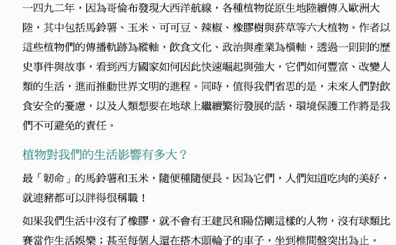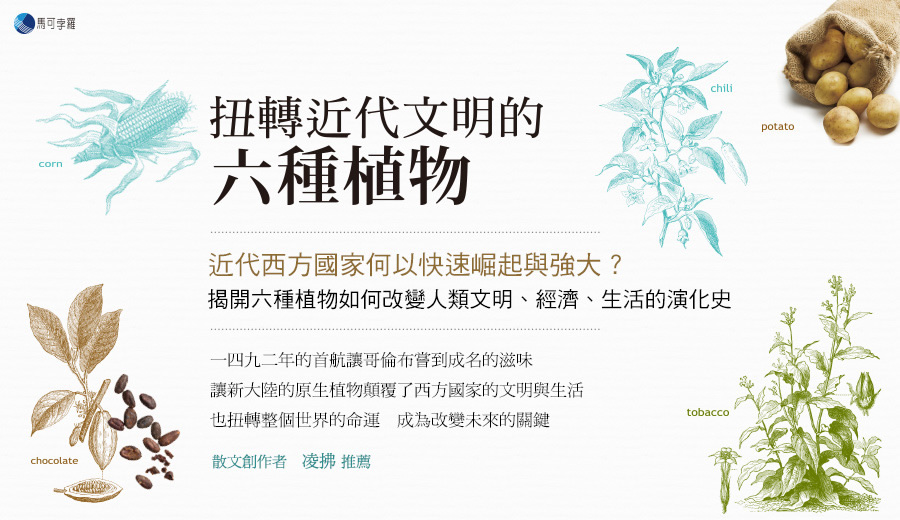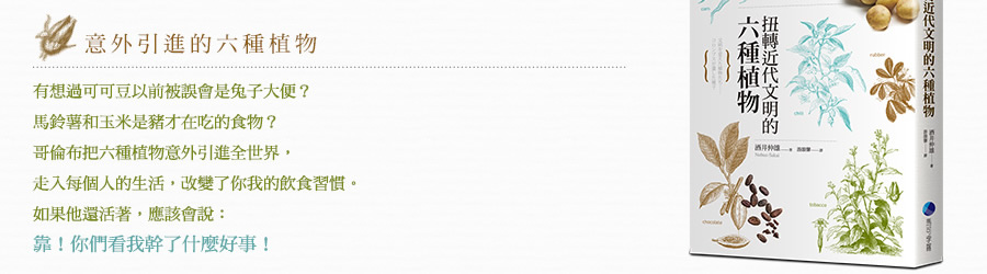 在沒有人知道水平線的另一端是什麼世界的時代,哥倫布(Christopher Columbus)從西班牙的帕洛斯港出發向西行,這趟航海旅程並非冒險家單純的探險行動。哥倫布滿懷壯志,準備發展大事業,因此這次航海的目的就是要前往亞洲,帶回辛香料與黃金。他將這次的計畫取名為「印地安事業」,與西班牙國王簽訂了契約,讓他有權分配在航海中獲得的利益,並保障他與家族的身分。換句話說,在西班牙國王的支持下,哥倫布的航海計畫才得以成行。 在總計四次的航行中,哥倫布意外發現了美洲大陸,受此影響,他從未踏上原本計畫的亞洲,事業發展也未見起色。此時哥倫布還不知道自己的航行將如何改變世界,就這樣在一五○六年五月二十日,於西班牙巴亞多利抑鬱而終,享年五十五歲。哥倫布最大的貢獻就是開拓美洲航線,打開新舊大陸之間的交流通道。在他死後,新舊大陸交流了很長一段時間,全球各地慢慢發生變化,逐漸形成現代社會。本書將從文化史的角度來探索哥倫布對人類社會的影響。 一四九二年十月十二日,哥倫布搭乘聖瑪利亞號,率領由三艘船組成的艦隊開啟首航。抵達加勒比海上的華特林島(現為聖薩爾瓦多島)之後,哥倫布很快就成為家喻戶曉的「新大陸」發現者。姑且不論美洲大陸原住民是最早抵達新大陸的人類,距哥倫布發現新大陸的四百多年前,早就有數十人在此建立過冬基地,從遺址判斷,他們曾經在這裡生活過幾年。 這是由古代斯堪的納維亞人在十一世紀抵達紐西蘭島時建立的過冬基地。古代斯堪的納維亞人就是現在大家耳熟能詳的維京人,在那個年代他們被基督徒視為「野蠻且慘忍的異教徒」,受到不平等的對待。 近來少有專家學者宣揚「哥倫布是新大陸發現者」的看法,大多認為「哥倫布是第一個抵達新大陸的人」,不過這個說法還是缺乏事實根據。若以目前得知的事實為基礎,第一個登上新大陸的人不是哥倫布,而是古代斯堪的納維亞人。儘管如此,依舊無損哥倫布的名聲,他的一生不斷點綴在各種傳記的書頁中,至今仍然令人津津樂道。究竟為什麼會有這樣的結果? 古代斯堪的納維亞人不只乘船登上新大陸,更在新大陸生活,遺憾的是,他們對於世界的影響僅只於在新大陸留下足跡,對於往後的歷史發展毫無建樹。更別說在學校教科書或任何一本傳記中,完全沒有留下古代斯堪的納維亞人曾經在新大陸興建過冬基地的紀錄,而且幾乎沒有人知道這件事。 一四九二年的首航打響了哥倫布的名聲,也讓他的航海大業成為永垂不朽的歷史。自此之後,愈來愈多人往來於歐洲大陸與新大陸之間,結果使得許多原生於新大陸的植物以各種型態傳入歐洲大陸,而這些植物帶來的利益也成為歐洲大陸發展的基礎,建構出全新的文明。就算哥倫布是第二個登上新大陸的人,其四次航海所開啟的「新文明形成」序幕,早就足以讓他名留青史。 新大陸原住民豢養的動物種類相當少,僅有的肉類來源就是火雞、鴨子與食用犬;反觀歐洲大陸,安地斯高地上的居民會飼養駱駝科的大羊駝以及羊駝,取羊肉食用、剪羊毛禦寒,除此之外,整個歐洲大陸都沒有人飼育牛、馬、羊、豬等大型食用家畜。話說回來,原生於新大陸的動物其實對於歐洲文明的影響十分有限,雖然新舊大陸開始交流之後,歐洲也慢慢出現飼養火雞的風潮,不過影響力僅止於此,沒有太大變化。 另一方面,深刻影響歐洲文明,催生出現代社會的幕後推手,其實是原生於新大陸的各種植物。如果沒有這些從新大陸傳入的植物,現代文明與飲食文化肯定會是另一種局面。 前往新大陸的探險家與船員們都會從新大陸帶回許多原生植物回歐洲,這些植物都是很珍貴的禮物,有些人會進貢給國王,或是送給大學的植物園作為標本種植。除了菸草一傳入歐洲就虜獲了所有人的心之外,大多數植物在剛開始進入歐洲大陸時都被當成景觀植物栽種,並無實質效用。隨著時間演變,有些植物的功效慢慢受到肯定,不只成功打入歐洲社會,更傳入亞洲和非洲。這個結果也佐證了比起法蘭西斯克‧皮薩羅(Francisco Pizarro)和埃爾南‧科爾特斯(Hernando Cortes)分別擊潰印加帝國與阿茲提克帝國,掠奪而來的金銀財寶,從新大陸傳入的幾種植物,對人類社會更具價值。 在原生於新大陸的植物中,馬鈴薯、番薯和玉米這三種植物單位面積的生產量相當大,讓過去一直處於飢餓恐懼的人們再也不用擔心吃不飽,從這一點來看,對於維繫人類生存並促進人口成長有極大貢獻。此外,辣椒、南瓜、番茄、四季豆、花生、向日葵(榨取葵花籽油)、鳳梨、腰果等植物,不只營養美味,也為飲食型態帶來很大的變化。 由可可豆(巧克力的主原料)、人心果樹的樹膠(口香糖的主原料)、菸草等原料製成的嗜好品是最好的生活調劑品,當人類吃、喝、用著它們時不只能感到放鬆,這些嗜好品還能促進人際關係,讓人與人之間的感情更融洽。橡膠可製成汽車與飛機的輪胎,也是電線的絕緣材料,是現代社會不可或缺的原料。當初如果沒有發現橡膠樹,就不可能維持現有的生活水準。唯一可以斷定的就是,假如沒有上述植物,無論是人類文明或是飲食文化,恐怕都會跟現在截然不同,而且那樣的社會相信也不會比現有的生活舒服。 本書特別從原生於新大陸的植物中,遴選出對於建構現代社會貢獻良多的馬鈴薯、橡膠樹、可可豆(巧克力)、辣椒、菸草與玉米等六大植物,深入調查
