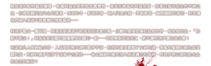 我看著父親從我膝上拿起花環,為他加冕;在他的金髮映襯下,花環的葉子似乎暗沉了不少。他的父親佩琉斯(Peleus)走到他身邊,微笑著,露出自豪的神情。佩琉斯的王國比我們小,但據說他的妻子是女神,而他也深受人民的愛戴。我的父親看著他們,眼神中充滿欣羨之情。他的妻子是蠢貨,而他的兒子跑不過比自己年幼的孩子。他轉頭對我說。