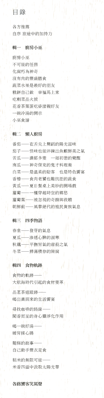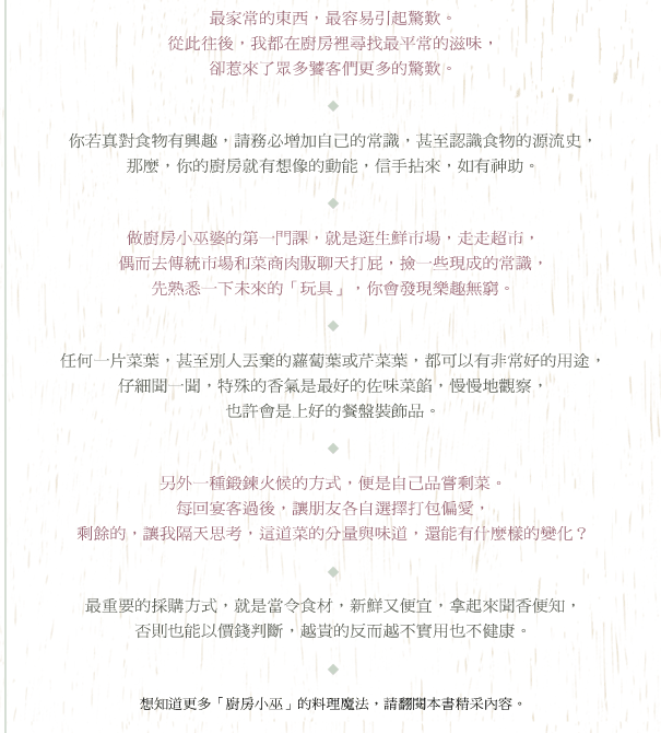 廚藝不精的入門巫婆,必須雙向進行,先不要嚇倒自己,功虧一簣。也就是說,不要去買那些看起來精美卻製作繁複的食譜,既不能立刻產生功效,更常常教人洩氣,弄不清程序分量與火候,徒然浪費寶貴時間與材料,打擊士氣還不打緊,自尊心受損可很難復原。