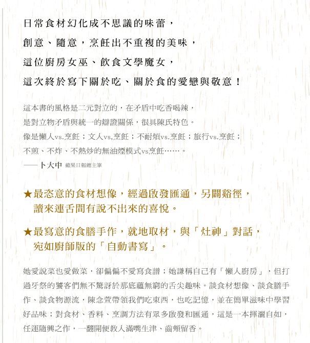 人生一大樂事,便是與三五好友共享美好時光,動手掌廚,發揮變魔術的媚惑力,更是無可比擬的趣味。巫婆的樂趣,就在於自己的調味讓「虜」動容(至於是哪一種效果,就各憑本事?!)