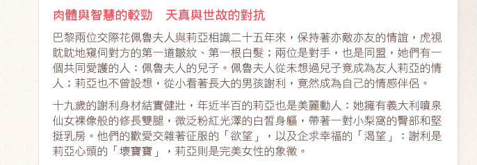 整頓午飯到結束,她心不在焉聽他說話。他已經習慣這位沉著冷靜情人的半沉默狀態,他滿足於她每天像母親一樣的斥責叨念︰「拿烤得最焦的那個麵包……別吃這麼多新鮮的軟麵包……你永遠不懂怎麼挑水果……」而同時間,暗自神傷的她狠狠訓誡自己︰「倒是我,得知道自己要什麼!我希望他怎麼做?要他站起來說︰『夫人,您在污辱我!夫人,我不是您想的那樣!』其實是我的責任。我像母雞帶小雞一樣照料他,盡把所有東西塞給他……我可曾想過他有一天會組織家庭,成為人父?我從來沒有想過!就算我曾經想過,就像帕東說的︰『是遺傳,是遺傳!』就算帕東接受格拉蒂絲的求婚,他這個人只會去兜一圈,就像聽到人家講起潮汐。而謝利呢,他有謝利的血液。他有……」
