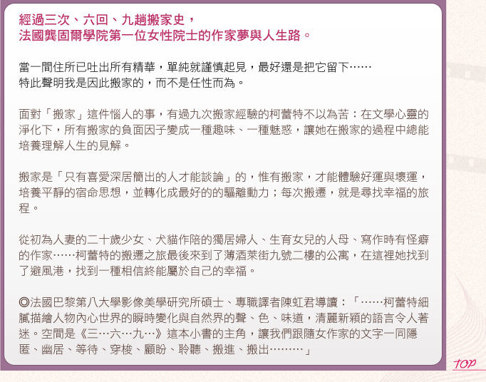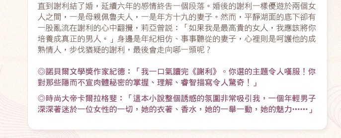 她默不作答。她哼著歌,彎腰撿起掉落的玳瑁髮簪,將它插進頭髮裡。她照著鏡子,得意地繼續哼唱,她為自己自豪,這麼輕易就克制住自己,避開兩人分離的唯一情緒波動時刻,沒讓這些不該說的話脫口而出︰「儘管說吧……乞求,要求,暫停一下……你剛才的話,讓我覺得幸福……」