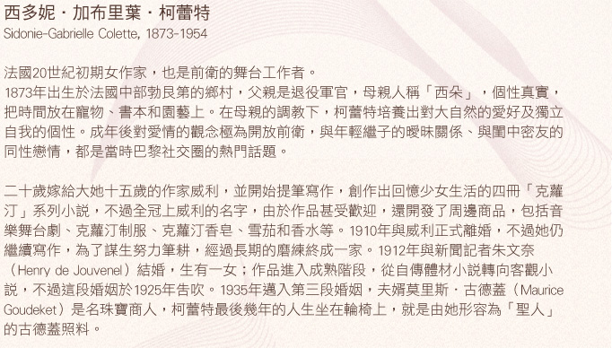 「奴奴,她啊!可厲害了。那個女人所到之處肯定屍橫遍野。一身寶石綠衣服,火紅頭髮,那身肌膚……簡直是十八歲少女,還有那微笑。我可敬母親的大嗓門都沒讓她眨一下眼。她等到這番攻擊的最後才回答︰『親愛的夫人,您或許最好別太高估令公子從一九一○年以來的積蓄……』」