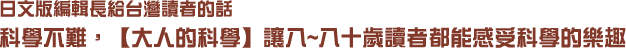 《親子天下》的出版品,多數關注的是小孩、家長、教師和學校,主題也聚焦在「教育和教養」。很多人好奇,為什麼《親子天下》會引進【「大人」的科學】中文版?為什麼日本學研社會將這套看似主打「文青」+「宅男」的夢幻產品,交給《親子天下》出版?