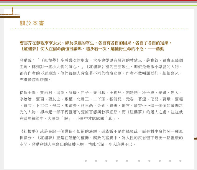 讀這一段,總覺得說不出來的心酸,這樣微不足道的人物,這樣不起眼的細節,《紅樓夢》的作者在大片錦繡的閃爍裡忽然放進一根樸樸實實的灰褐色的棉線。