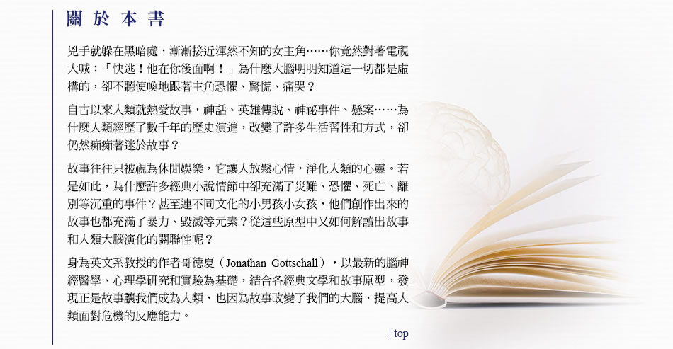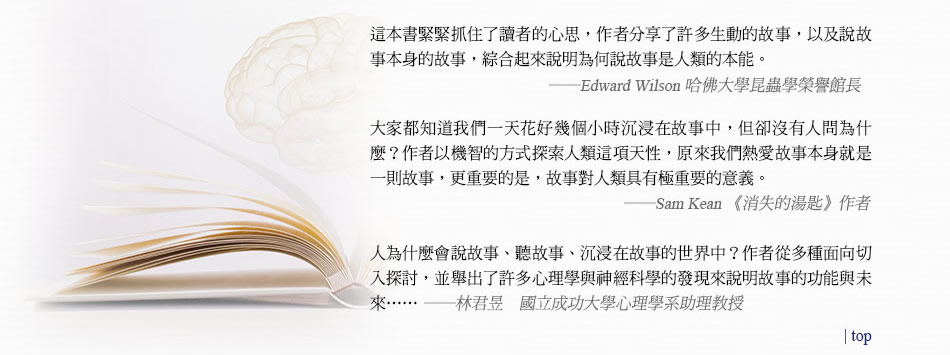 但科學可以幫我們解釋《長路》這樣的故事何以動人。本書藉由科學與人文領域的取徑,使用新工具、新思維,開啟夢幻島這塊廣闊未知的領域。本書談的是各種故事如何充斥在我們的生活周遭,從電視廣告到白日夢,再到職業摔角的滑稽場景。我所討論的是孩童所編造的幸福混亂故事中,那潛藏的模式,以及這些模式所顯示的故事史前之源。這本書談的是故事如何細微地形塑我們的信仰、行為與倫理,又如何對文化與歷史產生深遠的影響。這本書探索的是和精神病患一樣的深夜創意故事,也就是夢所存在的古老謎團。本書是關於一連串聰明卻又愚蠢好笑的腦波,在我們混亂的生活中強加上的一套敘事結構。這本書討論的是小說中當下的不確定性還有未來的希望。最重要的是,這本書寫的是故事所隱含的深層奧祕。為什麼人類沉迷於夢幻島?我們如何變成說故事的動物呢? |