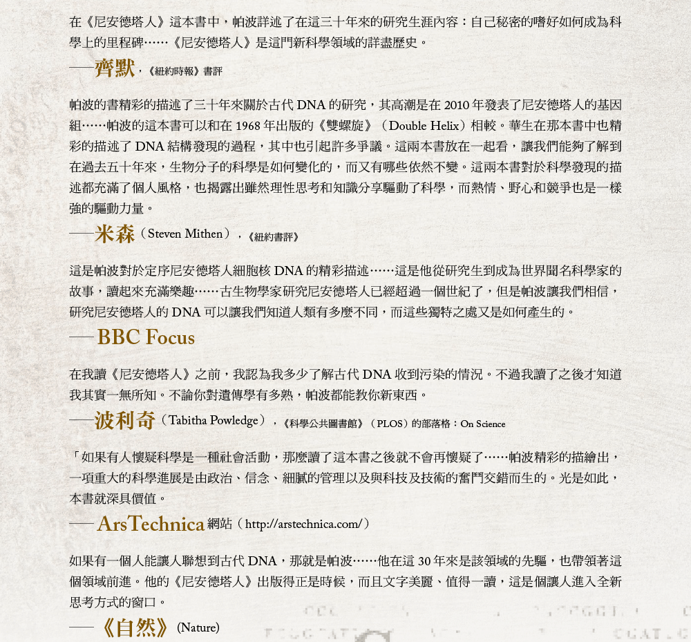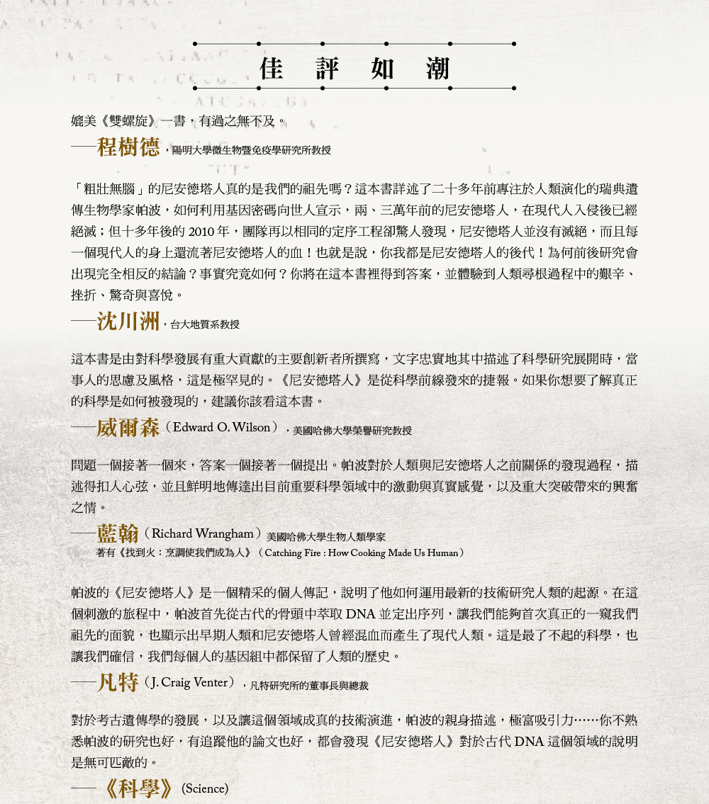 每次當我面對意料之外的大好結果時,心中很快就會充滿懷疑。我接著探究會出錯的可能性。之前或許有人用牛皮膠來修補化石,我們眼前的粒線體DNA序列可能是牛的。牛的粒線體DNA別人已經定序出來了,因此我們馬上比對,嗯,差異太大了,不是牛的。這份新的粒線體DNA序列和人類的非常相近,但是有些許不同之處。這時我開始相信,我們的確首次從已經滅絕的另一種人類上萃取出DNA並加以定序。