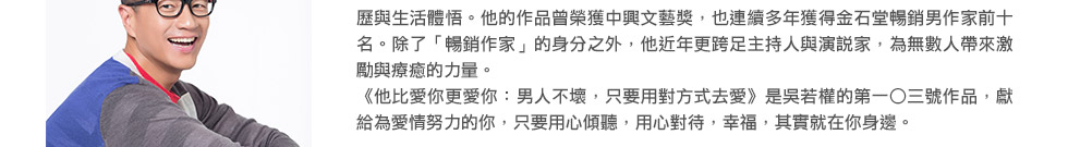 等他到了三十歲,甚至三十五歲,換他的女友開始為此煩惱,卻不是他的身形,而是他的心智年齡。這已經不是任何補品可以解決的問題,而是每個男孩都需要更多的人生閱歷,讓他轉變為一個成熟穩重的男人,懂得替自己,也為所愛的人負責。
