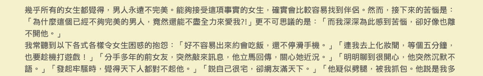 並非她對男友過度苛責,而是很多男孩在成長過程中被家庭過度保護,甚至被冠上「媽寶」的稱呼,即使穿上西裝、搭配很時尚的髮型或皮鞋,思想還是很稚嫩,像個大男孩。