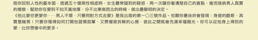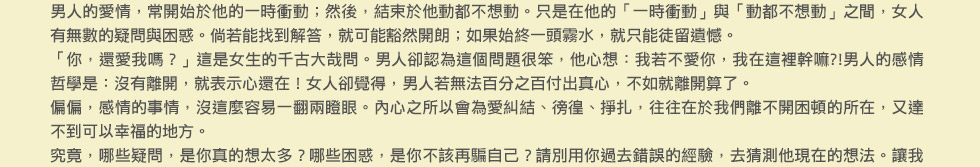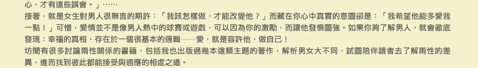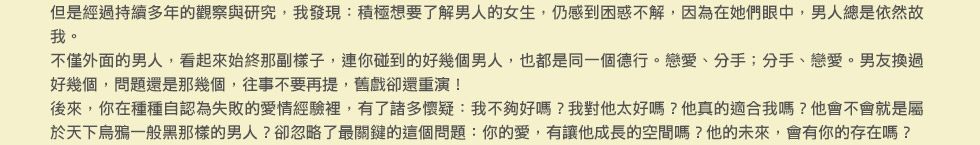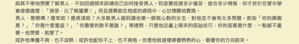 當一個男人願意為了愛而捨棄自己舊有的壞習慣,透過一段戀情,以勇敢的姿勢、負責的心態,投入新的人生階段,他就很快可以拿到一把正確的鑰匙,啟動幸福的大門。如果他一直沒有做好轉變的準備,身邊的女人會跟著受苦,直到她決定離開的那一天。