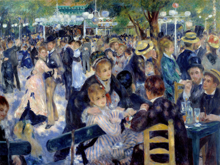 A:看起來是很怪,不過,雷諾瓦用這樣不尋常的色彩,是為了表現陽光落在頭髮上、舞池地上、跳舞的人衣服上時的光影效果。根據印象派畫家的理論,影子不完全是黑色或灰色,而是帶著其他淡淡的色彩。
