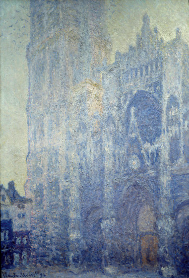 A:這是魯昂大教堂西邊的門面。通常應該站在遠處欣賞這幅畫,因為靠近時,影像看起來很模糊,原因是莫內在畫上用各種形態的色彩與筆觸,並且堆砌顏料,表現的並不是精確的細節。整幅畫有一種粗塗灰泥的效果,而且畫面上很多地方的顏料都很厚。