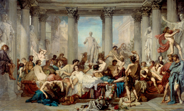 A:這些人參加一場宴會,而這張床是用來吃飯的,不是用來睡覺,因為羅馬人都是躺著吃飯,而不是坐著。不過,這張畫不是太真實,因為一般來說,客人不會一起使用同一張石床,每個人都會有自己銅製或是木製的沙發。