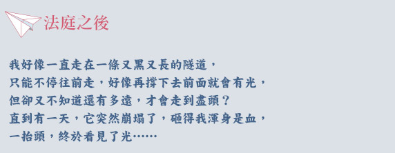 以前的我,總認為做什麼事都有方法、有規則;遇到別人有困難,我總是好為人師。但是,在婚變這件事情上,我不要再去做一個指導者,我也不適合。我唯一能幫助跟我有相同經歷的人的方式,就是把我的傷口打開給妳看,把疤痕打開給妳看,告訴妳,這終究會結痂的,妳還是可以活的。