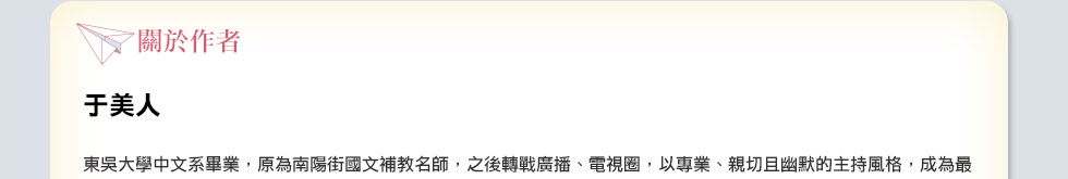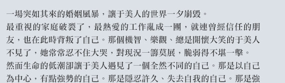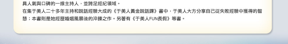 以往大家所認知的于美人,是個厲害的名女人,她很強勢,她的事業很成功,也把婚姻與家庭照顧得很好,可是婚變的消息一爆開之後,各種輿論、各種聲音都出現了,而且,竟然幾乎一面倒的撻伐我。