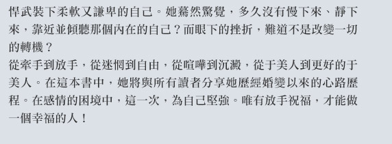 在這本書裡,我只是想呈現遭遇婚變的婦女會遇到的各種狀況,把自己經歷過的一切攤開給大家看,如果有人在裡面得到方法或幫助,那是她自己的東西。因為今天妳是三十五歲離婚,跟五十歲離婚,妳考慮的東西是不一樣的;如果妳的小孩是三歲,跟妳的小孩是十三歲,妳的心境也不一樣;所以,沒有一個固定的方法能幫助所有的人過去,每個人都有每個人要走的路。