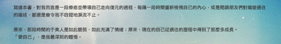 其實到現在,我還是沒有完全走出來,不會有什麼傷是「咻」的一下子馬上就好了,連疤也不留,有時我也還會耽溺在過去的情境中。但是從婚變中,我學到一個重點,就是任何事都不要太過主觀地去看,這也是這本書之所以會找許多朋友來聊的原因。如果由我自己來寫,難免會有太多的情緒在裡面,所以我找了一些朋友,請他們談談當時所觀察到的于美人,這是一種客觀,也是一種再一次的自我檢視。