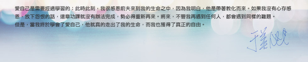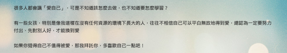 這些都是一定會經歷到的過程,妳不要害怕,就是一步一步的往前走,尋求朋友的陪伴、尋求專業人員的幫忙,妳會走過來的,妳會再找回自己的肯定,如果妳自己不肯定妳自己,別人只會把妳踩得更低。有我、有許多許多人都跟妳一樣,是從傷痛中一步一步走出來,並試著用另一種不同的角度,重新去看自己未來的人生。