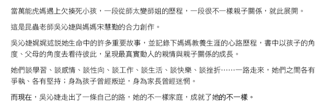 希望這是一本父母會想要拿給孩子看、孩子會希望父母看的書,