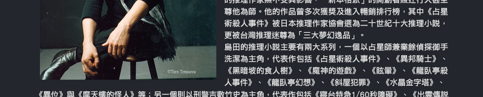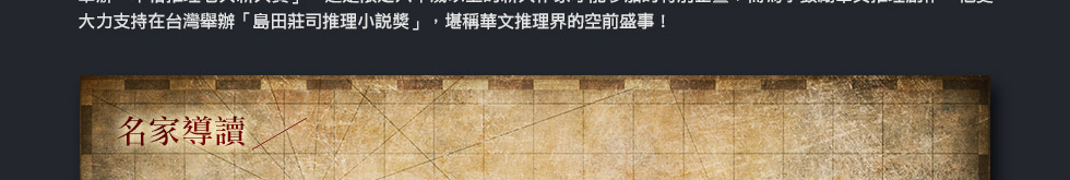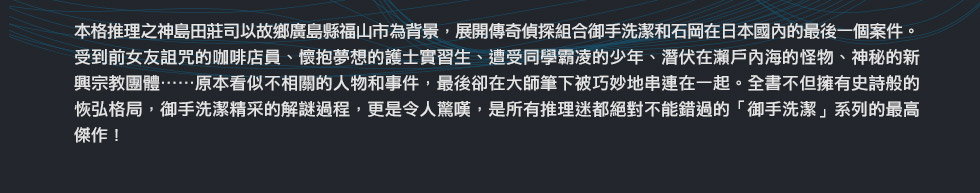 不過,御手洗在面對謎團之時,自始至終,已不再像《占星術殺人事件》(一九八一)、《黑暗坡的食人樹》(一九九○)那時的輾轉思索、反覆推敲,而是胸有成竹,一出手就是正解,在他的洞穿之下,沒有任何事物可以被隱藏、欺瞞,一切都立刻現出原形。這一次,不再有御手洗對決難解之謎的旗鼓相當,只要跟著御手洗的後頭行動,終究會撥雲見日、豁然開朗。