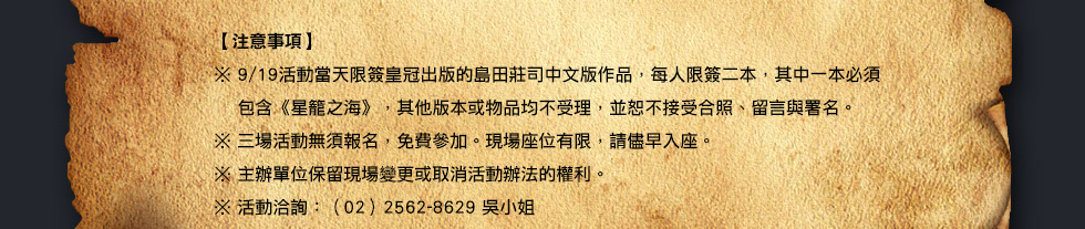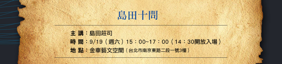 想不到,島田立即告訴我,《星籠之海》已經完成,更讓人訝異的是,這部作品正在進行籌拍電影的計畫。其實,島田筆下的另一名要角吉敷竹史,曾經拍攝過「警視廳三係‧吉敷竹史系列」電視劇,一共四集,由鹿谷丈史主演。但是,御手洗潔探案改編的電影,這還是頭一遭。對御手洗書迷的我來說,實在是令人萬分期待的好消息。