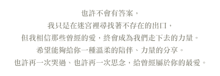 我不知道一個創作者,經由書寫、編造、再現,能否真的撫平些什麼?就像我們從來不確定,多少時間的流逝能沖刷掉心中的傷痕?但也許,這就是創作者無可推卸的特權,他可以記錄,可以昇華,可以用作品審視自己並贖罪。而且,更重要的,透過審視自己,他和我們分享成長。感同身受確實很難,但「試著」分享還是很重要。