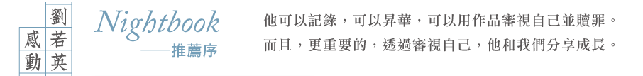 此時我按下了play鍵,Nightbook響起,我閉上眼睛,看見書宇站在海邊,牽起風吹長髮飄逸的妻子,他們對望,淡然笑著,然後一起望向了遠方……