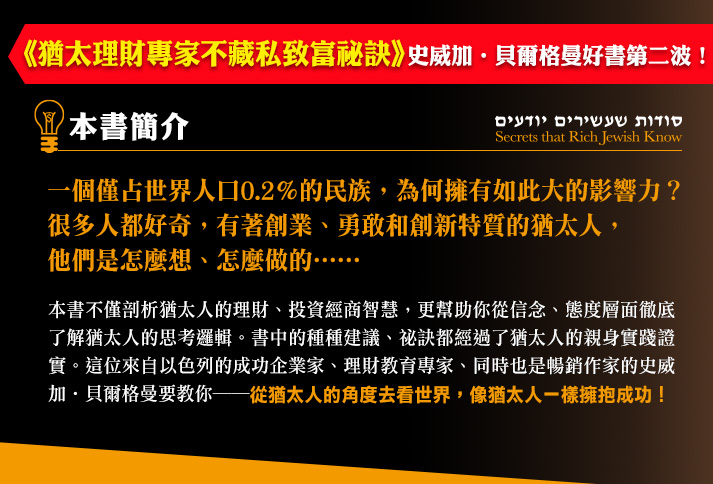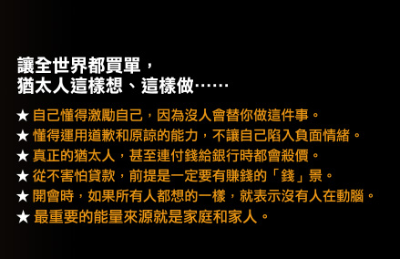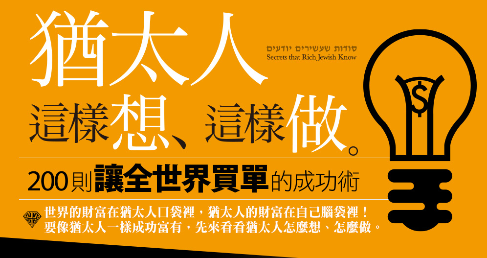 《猶太人都這樣想、這樣做:二○○則讓全世界都買單的成功術》是《猶太理財專家不藏私致富祕訣》的姊妹作。在兩本書中,我推薦讀者去學習猶太人的思維機制和思維方法,更要推薦你了解和使用猶太人的「工具箱」。