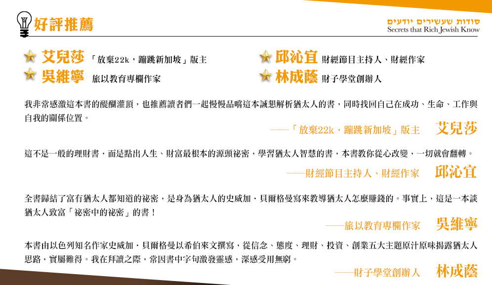 目前為止你做過什麼、想過什麼並不重要,別人怎麼看待你也不重要,重要的是從今天開始你能夠做些什麼。你希望能夠在未來實現自我,獲取成功嗎?你想要不斷進步,和現代社會共同發展嗎?你想在這個世界留下自己的印記和獨到見解嗎?你想要揭開猶太人之所以在經濟方面具備獨創性和創造力的奧祕嗎?我這兩本關於經濟和創造領域的書將帶你走進一個全新的世界,和你一起去挑戰極限。