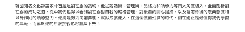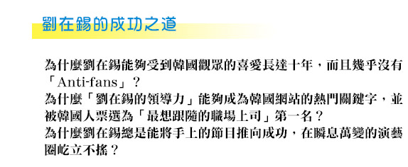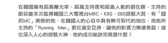 大眾分析師、同時也是留在錫的專業粉絲 ,從幾個要點 分析:說話術、管理術、品格力、領導力,分析劉在錫在藝能界屹立不搖的生存之道,