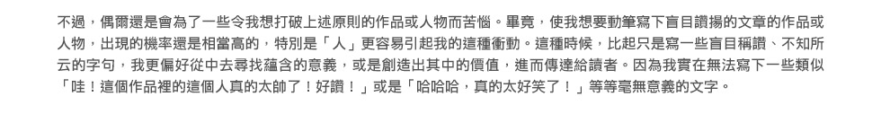 「我如果不拋棄一樣我喜歡的事物,我便兩樣都無法得到。事實上,我的年紀一天一天的在增加,一年又過一年,若不在體能或是其他的地方做點準備,下點工夫的話,明天的工作就不可能做到像去年或者是前年一樣。抽菸這件事也是,隨著時間的流逝,如果做這個也喘,做那個也吃力的話,一樣無法辦到。還有,做節目的時候,如果前面有個誰在跑給我追,我想要製造出驚險刺激的追逐場面的話,我也必須像跑在前面的人一樣能跑才行,這樣畫面才會有趣。所以……沒有辦法啊,就算我很喜歡抽菸還是要戒掉,嗯……理由很簡單,魚與熊掌不可兼得嘛!一定得拋棄點什麼。」