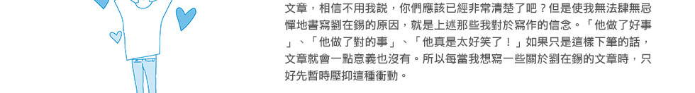 再加上劉在錫主持的許多節目都需要靠體能才能製造更多樂趣,在像「Running Man」這種追逐遊戲的節目裡,沒跑多久就不支倒地,一下就被對手抓到的話,有辦法帶給觀眾歡笑嗎?也就是說,劉在錫的工作環境本身,轉變為需要體能支撐才能帶來更多幫助的環境。他在「無限挑戰」節目中曾這樣說過: