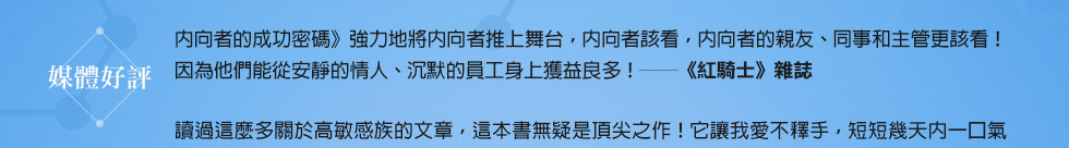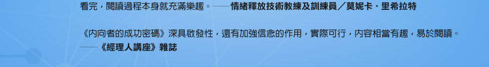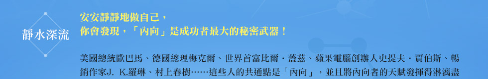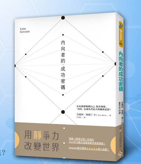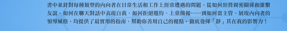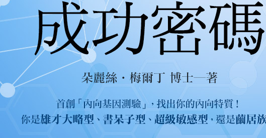 ──《內向者的成功密碼》首創「內向基因測驗」,將內向者的人格特質分成「雄才大略型」、「書呆子型」、「超級敏感型」和「繭居族」等四大類型,讓我們可以透過簡單的測驗,找出自己究竟是屬於哪一種類型的內向者,並針對內向者在日常生活和工作上經常遭遇的問題,提供了最實用的指南,幫助你徹底發揮「靜」其在我的影響力!