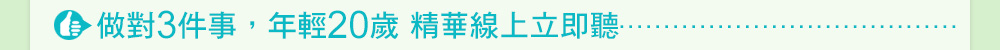 ●《做對3件事,年輕20歲》精華線上立即聽 http://goo.gl/gaMwNF