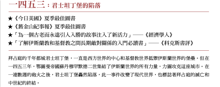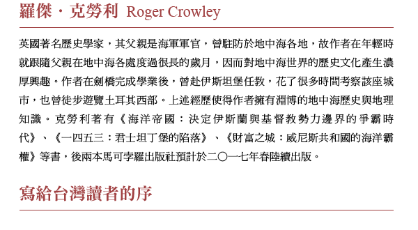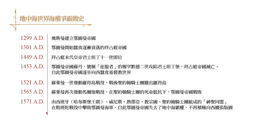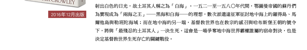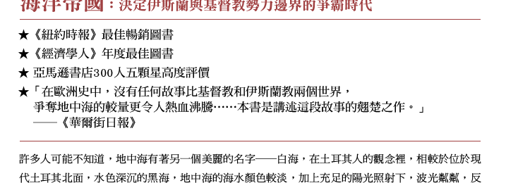 這場鬥爭將在宏大的戰線上進行,且往往遠超越大海的界限。歐洲人在巴爾幹半島、匈牙利平原、紅海、維也納城下與敵人激戰。但最終,在十六世紀,這場鬥爭的主角的全副力量都將集中於托勒密地圖的中心。這將是一場長達六十年的角力,由穆罕默德二世的曾孫蘇萊曼一世(Suleiman I)策動。戰爭於一五二一年正式爆發,於一五六五至一五七一年間達到高潮,在這六年無可比擬的血戰中,當時的兩位巨人──鄂圖曼土耳其帝國和西班牙的哈布斯堡王朝將高舉各自信仰的戰旗,至死方休。這場戰爭的結局將決定伊斯蘭教和基督教世界的邊界,並影響各個帝國未來的前進方向。這一切,都從一封信開始。 |