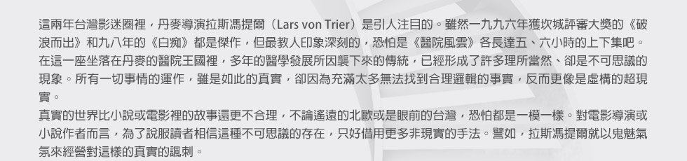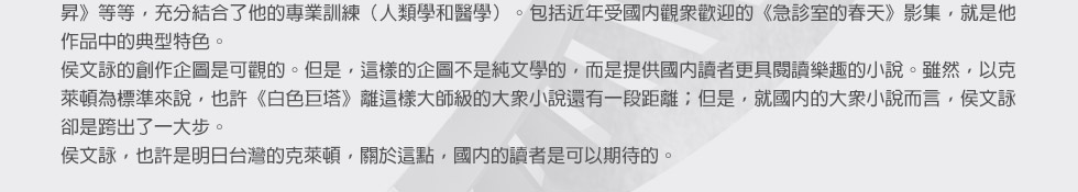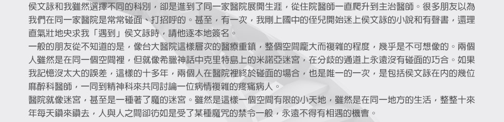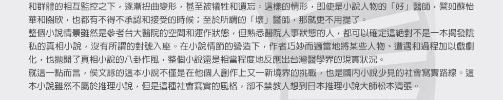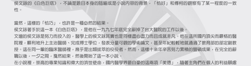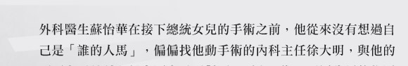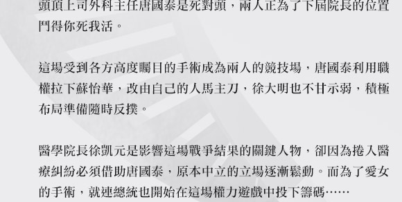 柵門打開,蘇怡華收回停車識別卡,他的汽車緩緩通過往地下停車場坡道。 才駛進醫院停車場,蘇怡華就覺得氣氛非比尋常。一路上,所有轉角路口,都站著平時不曾見過的人。這些人十分年輕,清一色留著平頭。儘管他們穿著便服,看起來若無其事的樣子,但他們配備的小手提包,以及從皮包縫口露出的無線電天線,都使這一組人馬在醫院裡顯得非常突兀。 等蘇怡華停好汽車,走進電梯間,迎面又看到兩個穿著西裝的陌生男人。其中有一位正忙著對佩戴在頭上的隱藏式的無線電對講機不知嘟囔些什麼,另外一個人看到蘇怡華走過來按電梯鈕,還客氣地對他笑了笑。等電梯來時,蘇怡華刻意回頭看這兩個人一眼,正好從側面瞥見講著話的那傢伙佩掛在西裝底的手鎗。這時,他約略可以猜想,發生了什麼事。 電梯停在六樓,蘇怡華走進外科部辦公室。迎面而來的是外科部唐主任以及他的行政助理辦公室。沿著主任辦公室左轉,開展的是一條長廊。在蘇怡華的印象中,這整棟醫院建築幾乎到處都有長廊,長廊給人一種次序、倫理或者是漫長的感覺。長廊左側是外科部的各個實驗室,右側則是一間一間的外科部主治醫師辦公室。這些辦公室依著醫師的年資一直排列下去的。最前面幾間是幾位已經退休的老教授辦公室。緊接著的是資深外科教授的辦公室。蘇怡華不知道這些辦公室的排列次序是怎麼形成的,外科部的住院醫師們就曾戲稱,不管開會或者辦公室的位置、風水地理,權力的展示在外科部是以距廁所的遠近為準則的。蘇怡華笑了笑,廁所坐落在剛剛外科部辦公室入口的地方,他自己的辦公室還要往前走,顯然和廁所有一段距離。 蘇怡華走進辦公室時,他的研究助理正好把咖啡粉舀到濾紙上。 「蘇醫師,你今天晚到了,一大早內科部徐大明主任打過三通電話找你。」研究助理把過濾器放入咖啡機中,「你要不要也來一杯?」 蘇怡華點點頭。 「三通電話?」他想不出徐主任找他什麼事?他們彼此不熟,也沒有什麼醫療上的往來。 她打開開關,發出蒸氣通過濾紙滴滴答答的流水聲響。 「聽起來他找得很急,你最好先回個電話。」 助理小姐把咖啡遞給他,就逕自去打電話。過了不久,電話接通了,她把話筒傳給蘇怡華。 「徐教授早,我是外科蘇怡華醫師。」 「我看到在台灣醫學雜誌上有一篇你的作品:經皮膚穿刺內植式中央靜脈輸液管裝置及併發症處理:1000例病例報告分析,恭喜你,寫得很好。在台灣這方面你可以說最有經驗。你很年輕,不容易啊,不容易。」 「不敢當。徐主任過譽了。因為是小手術,別的外科醫師可能興致不高,所以我做得比較多。」 「你做得很好,我們都打聽過,不要客氣。」徐主任稍停了一下,「不曉得你方不方便過來一趟?有一些關於內植式中央靜脈輸液管手術的問題我想私下向你請教?」 蘇怡華放下拿在左手的咖啡,看了看錶說: 「當然可以,只是我和住院醫師約了去病房迴診,也約了幾個病人家屬要說明病情,所以如果晚一些的話……」 「蘇醫師,我知道這樣有些唐突,不過我希望你現在馬上直接過來,並且不要和別人多說什麼,」徐主任停了一會,「你剛剛進醫院時看到了很多安全人員,對不對?不瞞你說,總統先生現在就在病房裡。」 *** 「你先看看這個。」徐教授一頭花白的頭髮,他挪動矮胖的身材,起身把一本病歷遞給蘇怡華。「你知道,總統就這麼一個寶貝女兒。」 蘇怡華坐在偌大的內科主任辦公室會客間,相對於外科主任辦公室,這個地方顯得空空盪盪。他大略翻了一下病歷。病人陳心愉是十七歲女性的急性白血病患者,做過第一次化學治療,正進入第一階段恢復期。目前她各項血球檢驗數目顯示治療情況還不錯。 「心愉這個孩子算是很乖,治療期間也一直很配合。嘔吐、掉頭髮對她都不是問題,可是就靜脈注射還有抽血這件事,簡直要她的命。」徐主任挪了身體靠過來對蘇怡華說,「你知道,總統府離這裡很近,總統一天到晚待在這裡,連辦公室王世堅主任都跟我們院長抱怨。凡是抽血打針,沒有一次心愉不是呼天搶地,簡直比兩岸會商還傷腦筋。每次總統皺眉頭,我們也要命。我們打算在第二次化學治療之前裝置內植式中央靜脈輸液管,你覺得如何?」 「時機是不錯,」蘇怡華考慮了一下,「但是目前內植式中央靜脈導管技術的發展還沒有到完全成熟的地步,尚無法完全排除併發症的可能性。」 「這個我了解,」徐主任稍停了一下,「依雜誌上的報告,你們的方法比傳統的辦法併發症少,是嗎?」 「經皮膚穿刺的植入法比傳統手術方式傷口比較小,恢復時間快,感染的機會也大大降低,」蘇怡華點點頭,「可是像中央靜脈栓塞、上腔靜脈症候群這類的問題恐怕仍然存在。」 「機會大不大?」 「我們的統計大約介於千分之二、三十之間,不過我相信最近發生併發症的機會應該更低。」 「為什麼?」 「因為那一千多個病人的緣故,我們的經驗多了。」 徐主任站起身來,支著手繞沙發踱來踱去。他一句話不說,幾乎忽略了蘇怡華的存在。 「就算千分之二、三十還是很高的機會,」徐主任喃喃唸著。 過了好久他抬起頭來問: 「東京,或者是紐約那邊的結果怎麼樣?總統府想知道,有沒有必要請國外的醫師過來幫忙?」 「他們最好的成績也不過是千分之六、七十之間的併發症,」蘇怡華搖搖頭,「而且大部分還用傳統的方法,病例數也沒這麼多。」 徐主任又來回踱了一