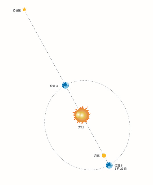 圖5-10 每年地球在位置A和位置B時,其相對於恒星的位置是完全相同的